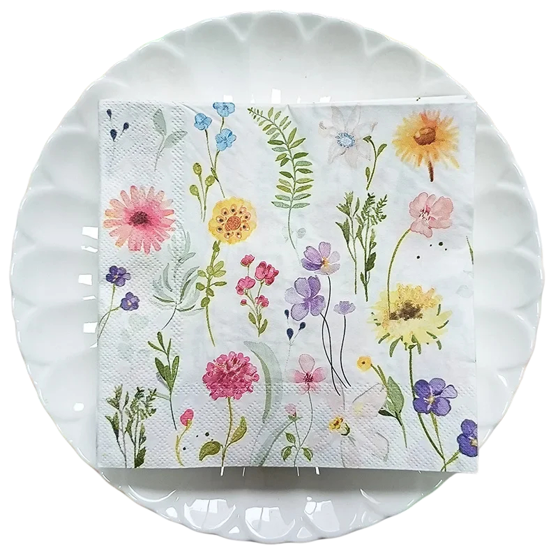 Blomsterpapirservietter med motiv af markblomster i størrelsen 33 × 33 cm til stilfuld og naturlig borddækning. Fuld beskrivelse