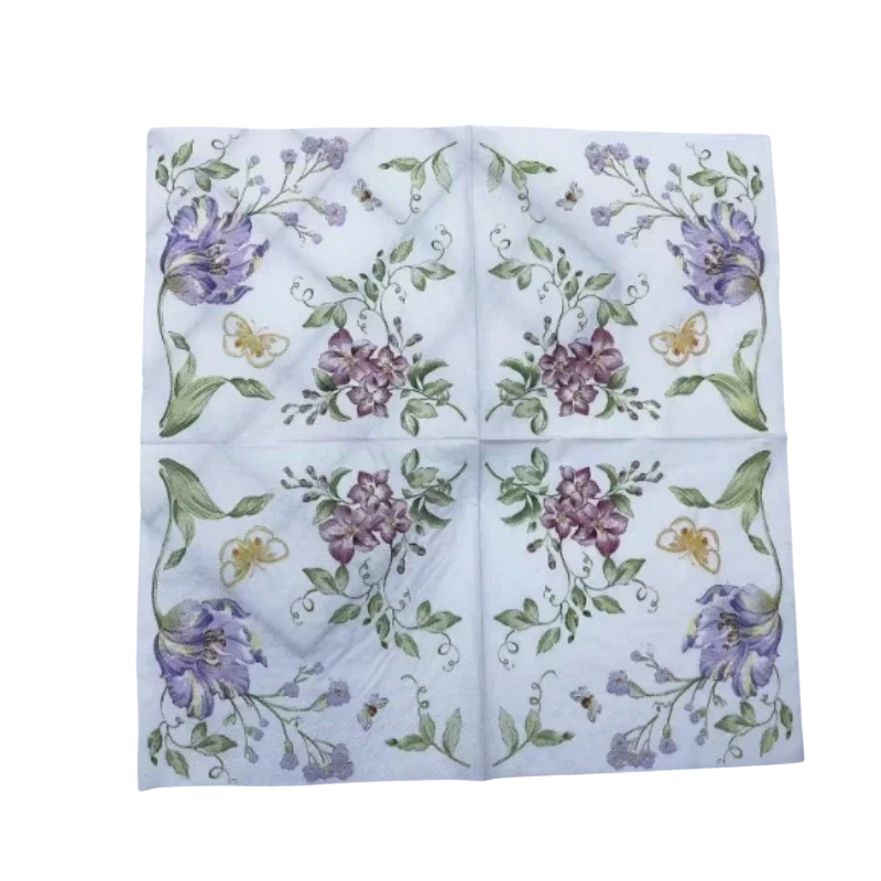 Dekorative servietter er et praktisk og æstetisk supplement til ethvert bord. De fine blomster og sommerfuglen skaber et harmonisk udseende, der understreger den festlige atmosfære. Takket være det kvalitetsmateriale er servietterne tilstrækkeligt stærke og behagelige at røre ved. Den ideelle løsning for alle, der ønsker at kombinere funktionalitet med elegant design. Perfekt løsning til stilfuld borddækning uden kompromiser.