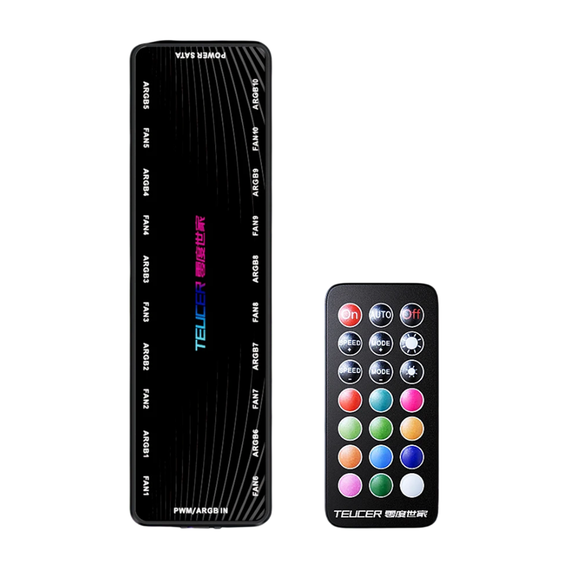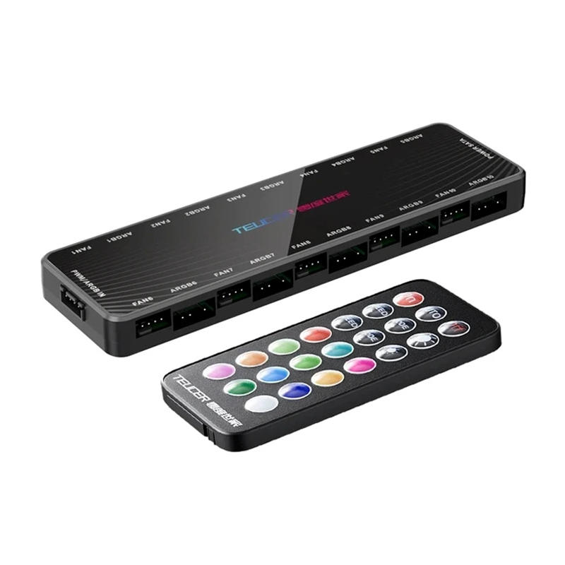2i1 hub PWM og ARGB med 10x 5V 3pin og 10x 12V 4pin SATA strømforsyning, magnetisk base og ARGB fjernbetjening 16,4x4,8x1,5 cm