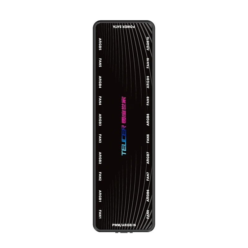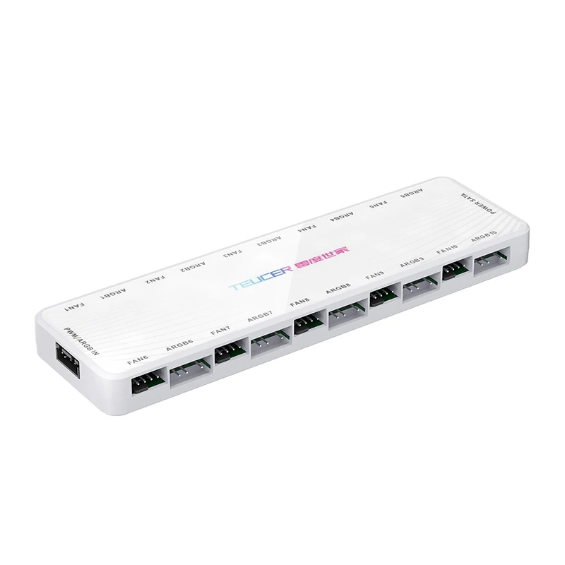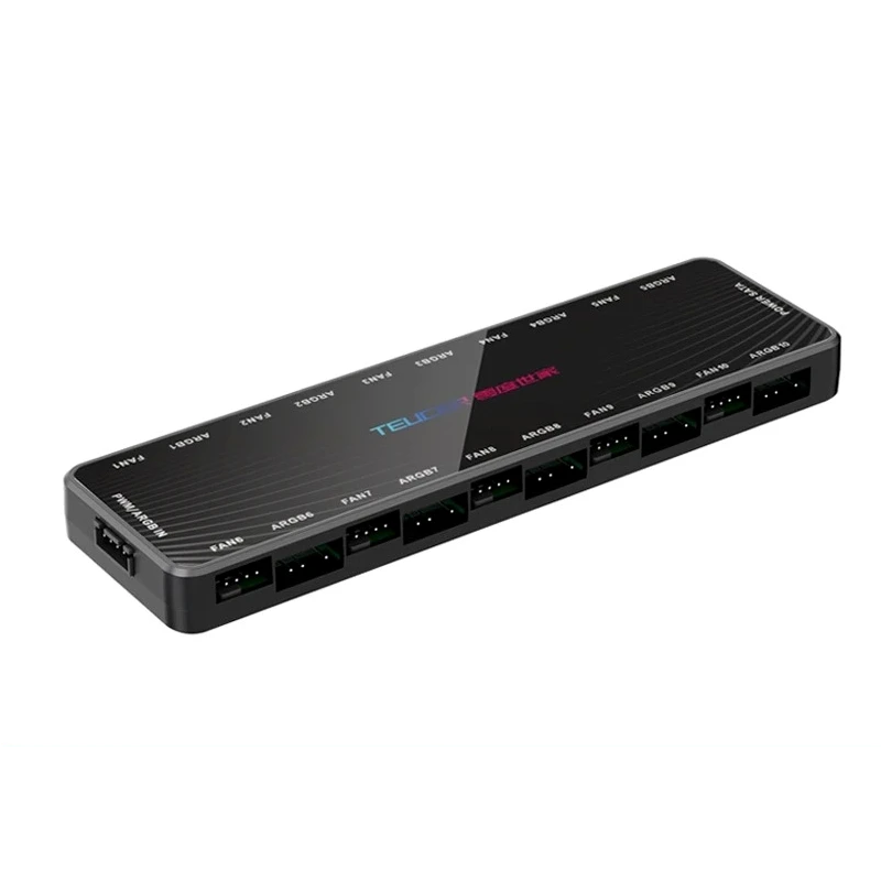 2i1 PWM og ARGB hub 10x 5V 3pin og 10x 12V 4pin SATA strømforsyning 3/4pin indgang magnetisk base 16,4x4,8x1,5 cm