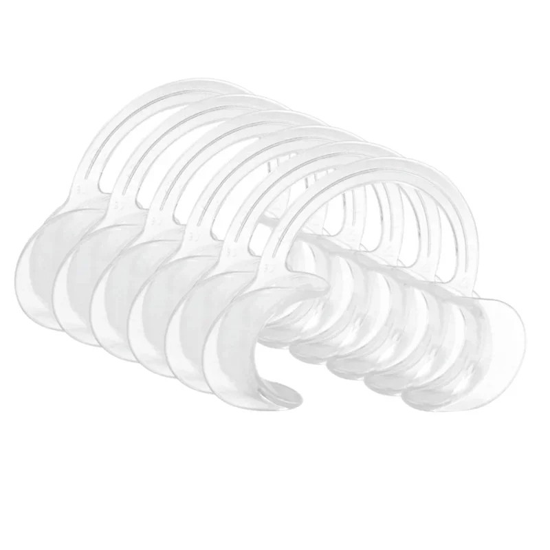 Sæt med fem plastiske C-formede retraktorer til sikker åbning af munden under behandling, blegning, tandregulering og andre tandlægeprocedurer. Fuld beskrivelse