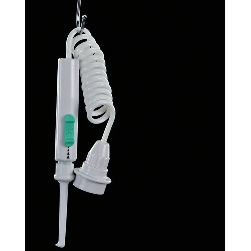 Praktisk irigator til rengøring af mellemrum mellem tænderne, der kan tilsluttes vandhanen. Uden strøm, med justerbart vandtryk og et sæt dyser og adaptere. Fuld beskrivelse