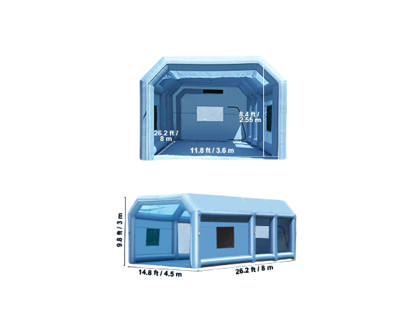 Bærbar oppustelig skur med dobbelt ventilator 8 x 4,5 x 3 m blå til lakering af biler, motorcykler og mobil arbejdsplads