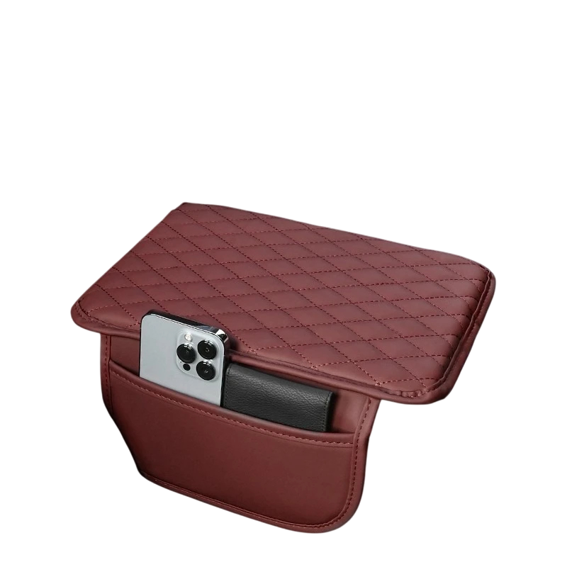 Rød beskyttende cover til armlæn med pude, lomme og opbevaringsplads. Øger komforten under kørslen, beskytter armlænet og hjælper med at holde orden i bilen. Fuld beskrivelse