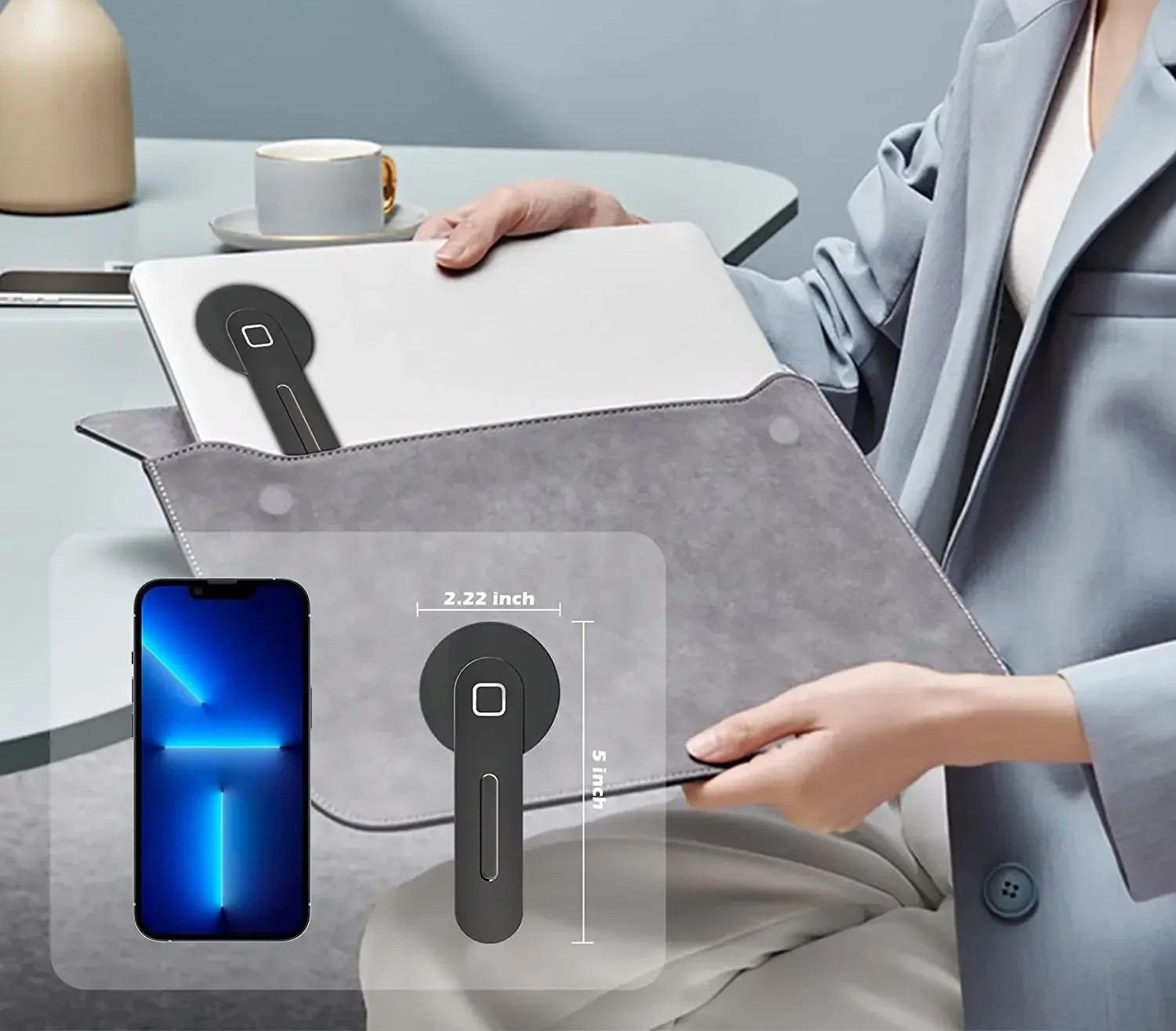 Holderen er velegnet til telefoner med magnetisk fastgørelse, eller det er muligt at bruge en metalring til enheder eller covers uden magnet. Fastgørelsen til den bærbare computer eller skærm er designet til ikke at begrænse enhedens funktionalitet og bevare et rent udseende i arbejdsområdet. Den blå farve virker moderne og passer ind på kontoret såvel som i hjemmekontoret.
