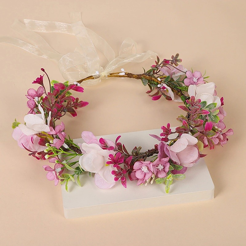 Blomsterkrans til hår Rosa cremefarvede engblomster Romantisk hårpynt med små blomster og gennemsigtig bindebånd