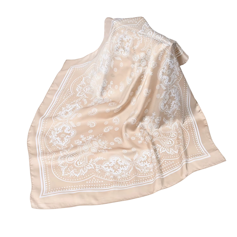 Boho elegance i let og luftigt design. Dette firkantede tørklæde med målene 70 x 70 cm er designet som et universelt tilbehør til kvinder, der ønsker at tilføje blødhed og personlig stil til deres outfit. Takket være materialet med silkeeffekt fremstår det luksuriøst, men forbliver komfortabelt og behageligt at have på. Tørklædet kan bindes som hovedbånd, stilfuldt hårbånd eller let tørklæde om halsen. Det vil perfekt komplementere sommerkjoler, bluser og enkle t-shirts.