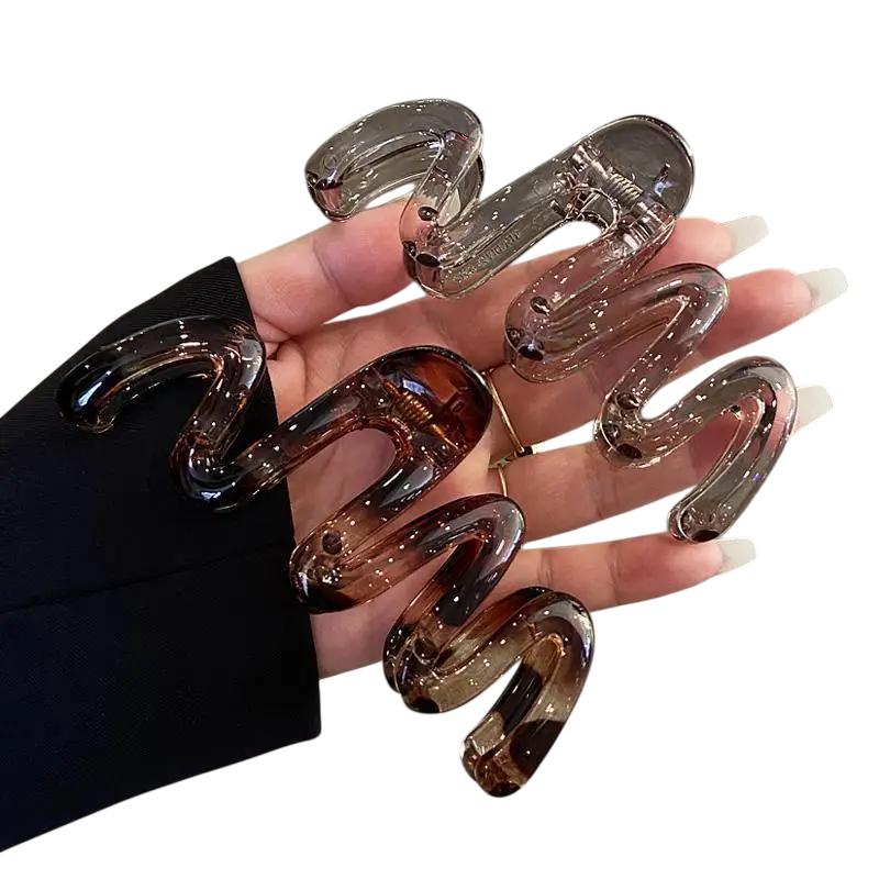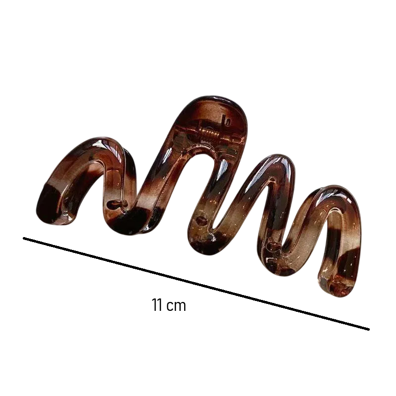 Moderne hårtilbehør, der kombinerer minimalistisk design med praktisk anvendelse. Den elegante bølgede form virker blød og stilfuld, hvilket gør den velegnet til både daglig brug og mere elegante outfits. Klipsen er designet til at holde håret fast uden ubehageligt træk. Takket være den lette konstruktion er den behagelig selv ved daglig brug. Det gennemsigtige design gør det desuden nemt at matche med enhver klædestil.