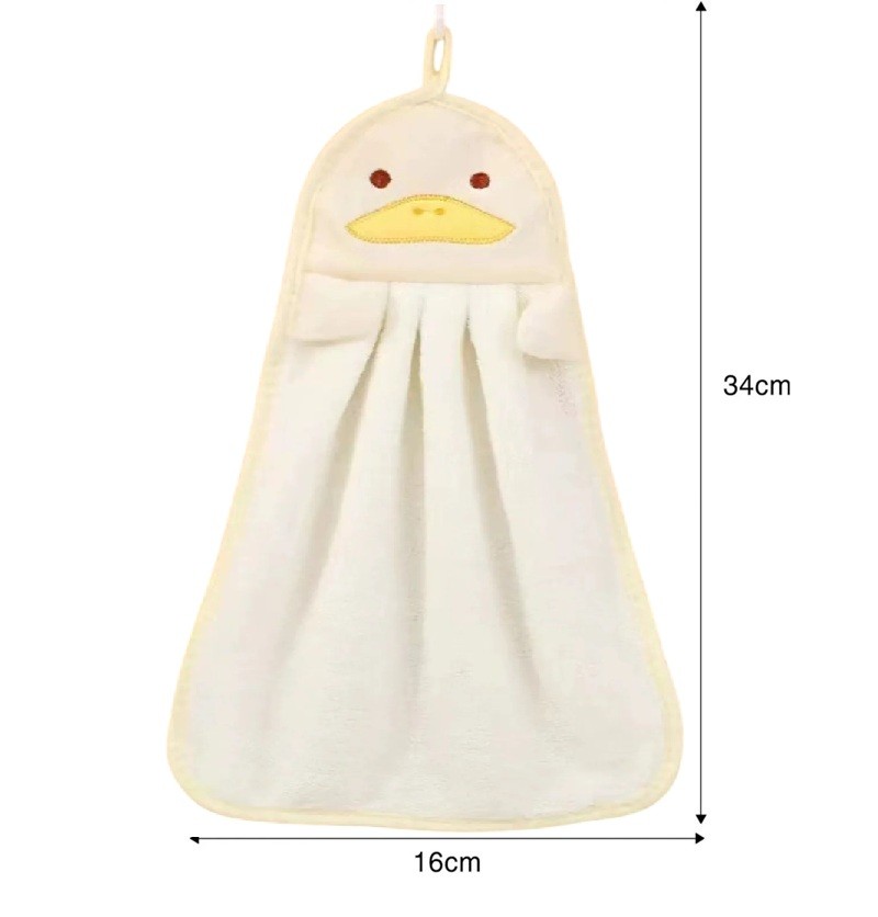 Blødt børnehåndklæde til badeværelset med et muntert andemotiv, praktisk ophængsløkke og kompakt størrelse, der er velegnet til daglig brug. Fuld beskrivelse