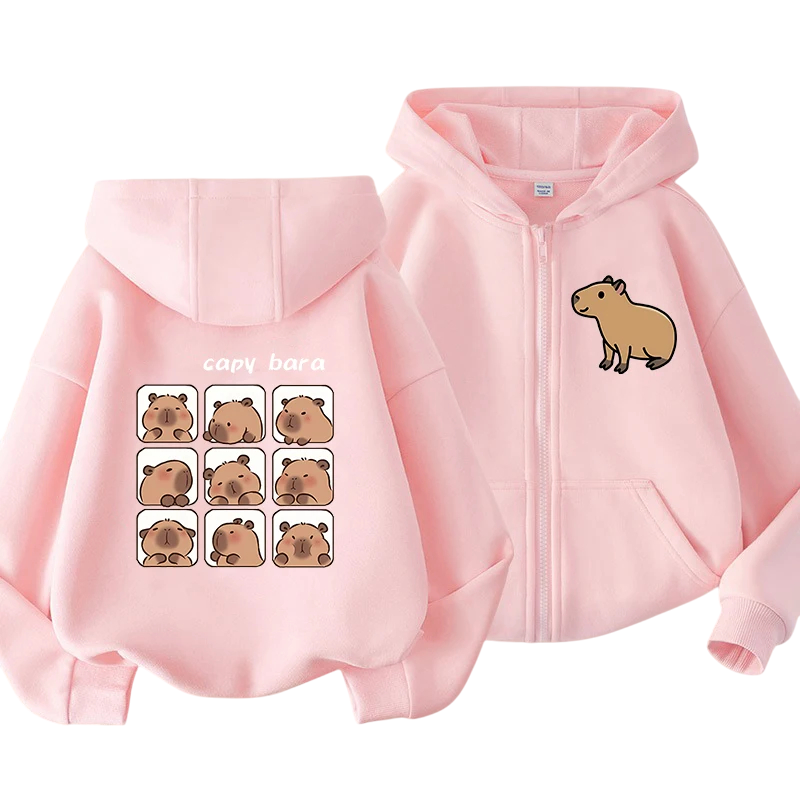 Sød børne hoodie med lynlås og kapybara motiv i kawaii stil. Let polyester materiale, praktiske lommer, ideel til både drenge og piger. Fuld beskrivelse