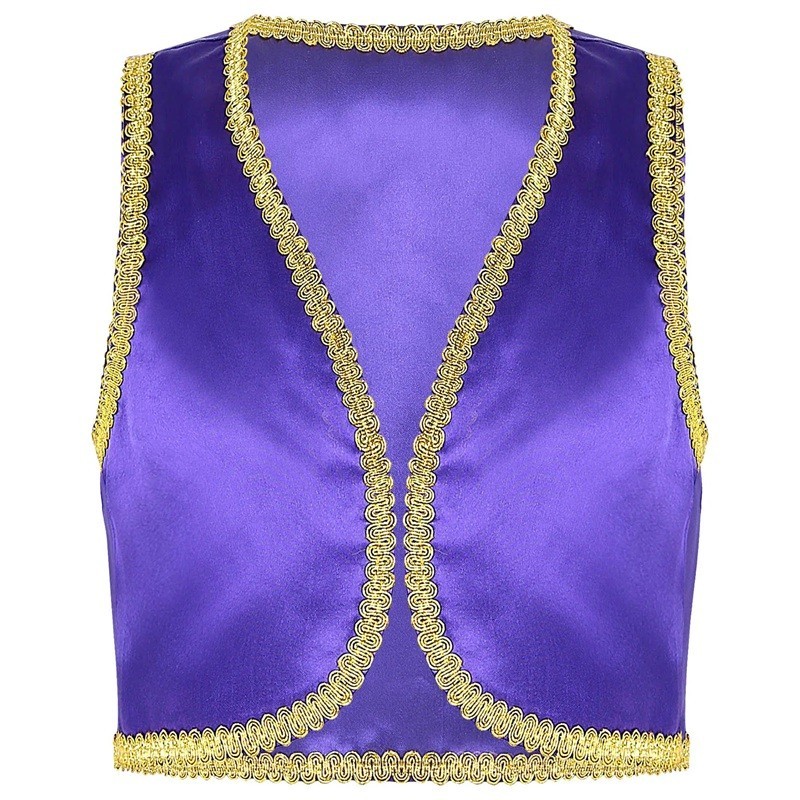 Dette børnekostume arabisk prins vil bringe magi fra orientalske eventyr ind i børns garderobe. Fremstillet af skinnende og let polyester, giver det komfort selv ved længere brug. Guldkanten og den åbne snit af denim vesten giver kostumet et autentisk udseende inspireret af eventyr fra De Arabiske Nætter. Vesten er ideel til karneval, Halloween, maskeballer eller cosplay fester og kan nemt kombineres med løse bukser eller accessories som turban eller bælte. Takket være den ensfarvede udførelse i forskellige nuancer kan man nemt vælge den variant, der bedst passer til barnets karakter og stil.