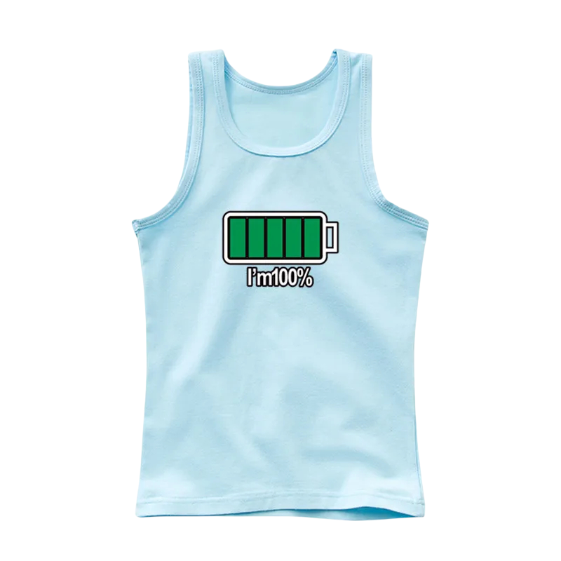 Børns bomulds tanktop med tryk af opladte batterier og teksten I’m 100% Enfarvet ærmeløs T-shirt med O-hals Sommer top til drenge og piger