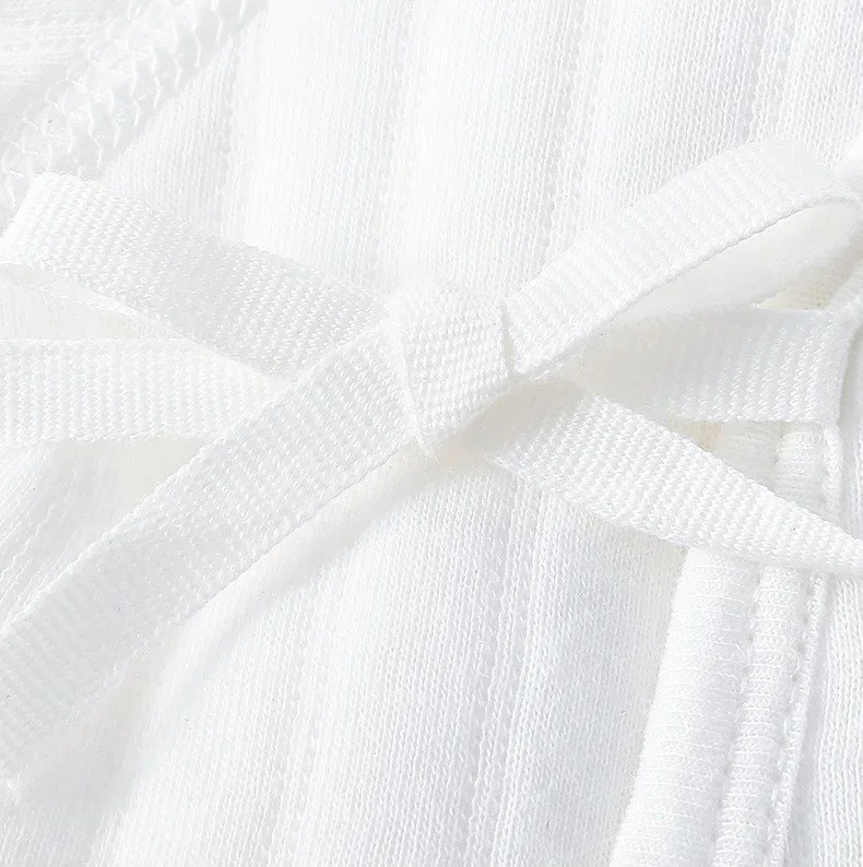 Denne børns bomuldsheldragt med lange ærmer repræsenterer den ideelle kombination af komfort, praktisk anvendelse og sødt design. Den er lavet af blød og åndbar 100% bomuld, som sikrer maksimal komfort selv ved længere brug. Takket være det bløde materiale er heldragten skånsom mod den sarte børns hud og velegnet til brug hele året. Det smukke bjørnemotiv på brystet og to dekorative sløjfer giver outfittet et magisk udseende, mens V-halsen og praktisk knaplukning gør det nemt at tage på og skifte ble.