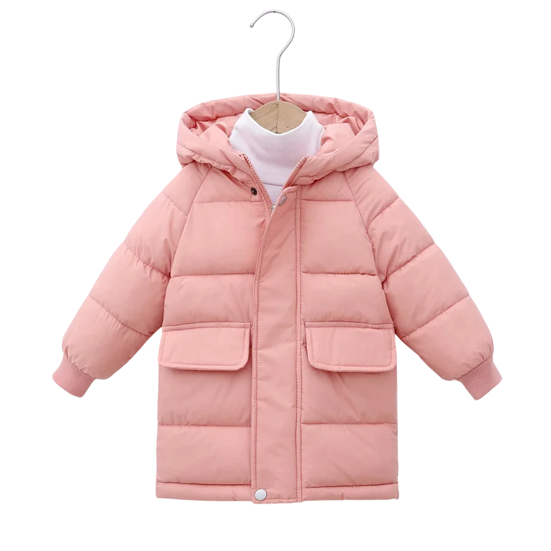 Forside Forside Tøj og tilbehør Børnetøj Pigetøj Pigefrakker, jakker og veste Pige vinterjakker Børns ensfarvede vinterjakke med hætte Lynlås og knapper Lommer Varm bomulds-polyester vinterjakke til børn Komfortabel jakke