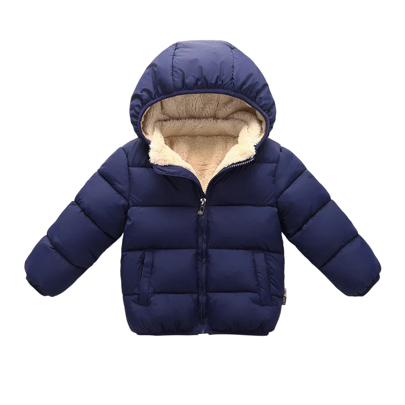 Børns ensfarvede vinterjakke med hætte Varme bomulds- og uldjakke med lynlås Behagelig vinterfrakke til børn