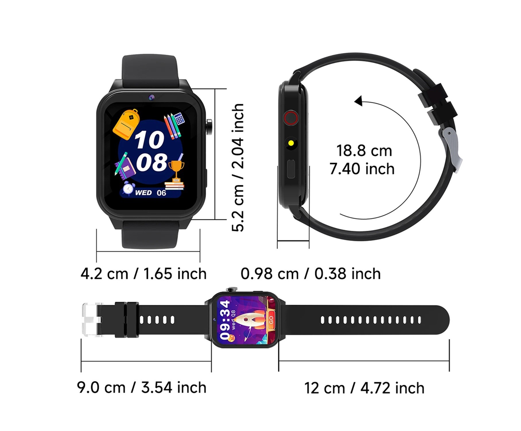 Børns smartur 18,8 cm længde på remmen 4,2 cm bredde 5,2 cm skærm 18 spil søvnmonitorering lommeregner vækkeur Uddannelsesmæssige spilleure