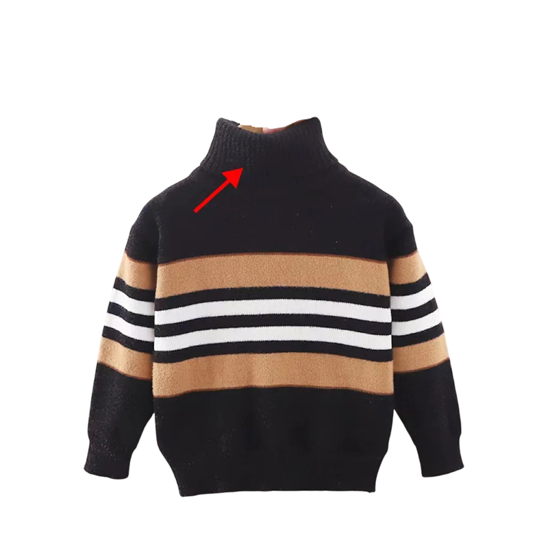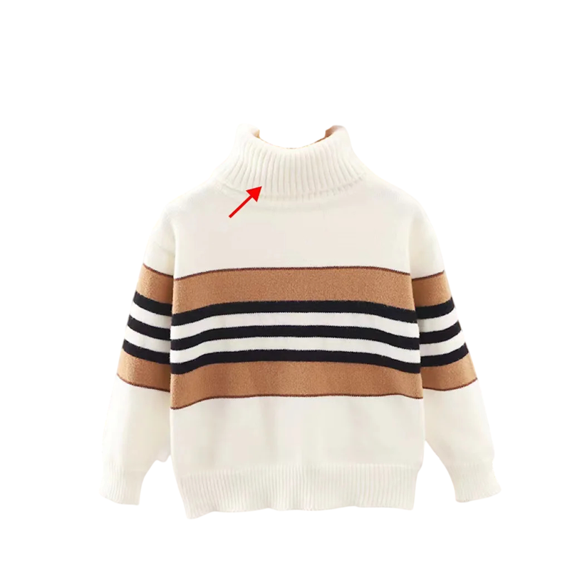 Stilfuld børnestribet sweater med høj krave og rullekrave, lavet af blød polyester og acetat, ideel til kolde dage. Fuld beskrivelse
