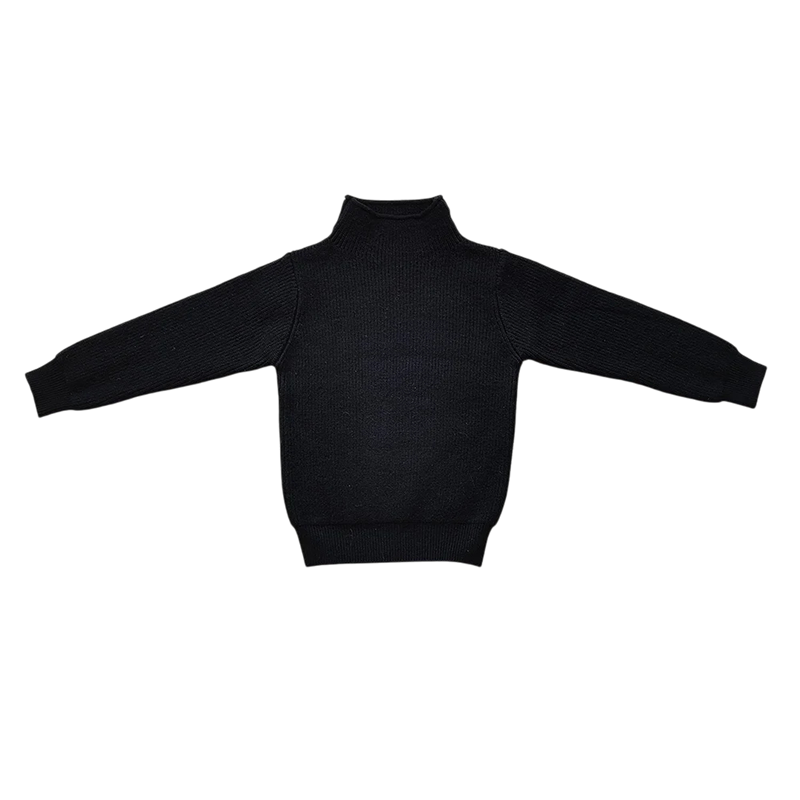 Denne børns sweater tilbyder den perfekte balance mellem stil, komfort og funktionalitet. Rullekrave design beskytter pålideligt mod kulden, mens den bløde bomuldsblanding holder kroppen varm uden overophedning. Takket være det elastiske materiale tilpasser sweateren sig barnets bevægelser og bevarer sin form i lang tid. Det enkle og elegante udseende sikrer, at den passer til både daglig brug og festlige lejligheder. Denne stilfulde, varme og alsidige sweater vil blive en favorit i hvert barns vintergarderobe.