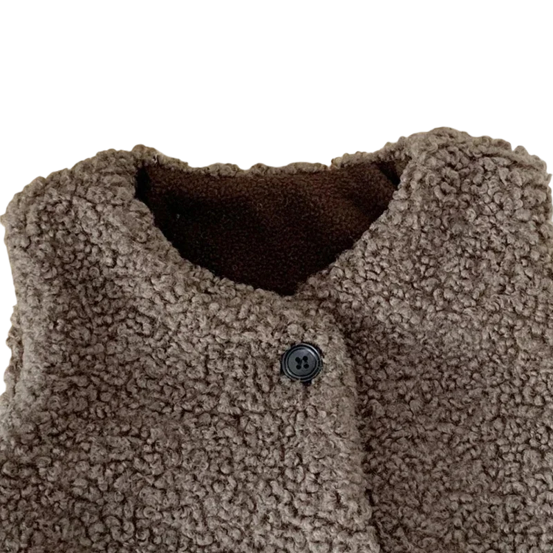 Børns vintervest i lammeuld med V-hals Enfarvet plysvest med knapper Varm efterårsjakke til drenge og piger Samtale udførelse