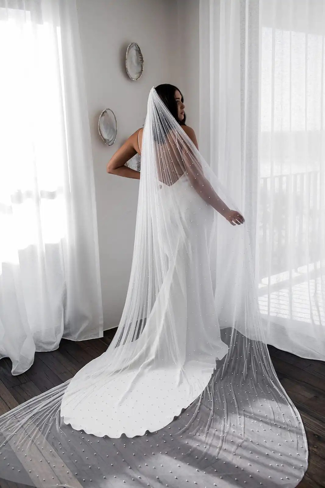 Dette hvide bryllups slør med en længde på 300 cm (Katedral stil) skaber en markant og majestætisk effekt, der perfekt fremhæver den festlige atmosfære på bryllupsdagen. Takket være sin længde virker det meget elegant og skaber en smuk kappe, der flyder bag figuren ved hvert skridt. Det fine enlags tyl er let, luftigt og reagerer naturligt på bevægelse, hvilket giver det samlede udseende en æterisk lethed. Overfladen af sløret prydes af fine perler, der diskret reflekterer lyset og skaber et luksuriøst indtryk uden overdreven prangendehed. Den praktiske metal kam muliggør nem og sikker fastgørelse i bryllupsfrisuren.