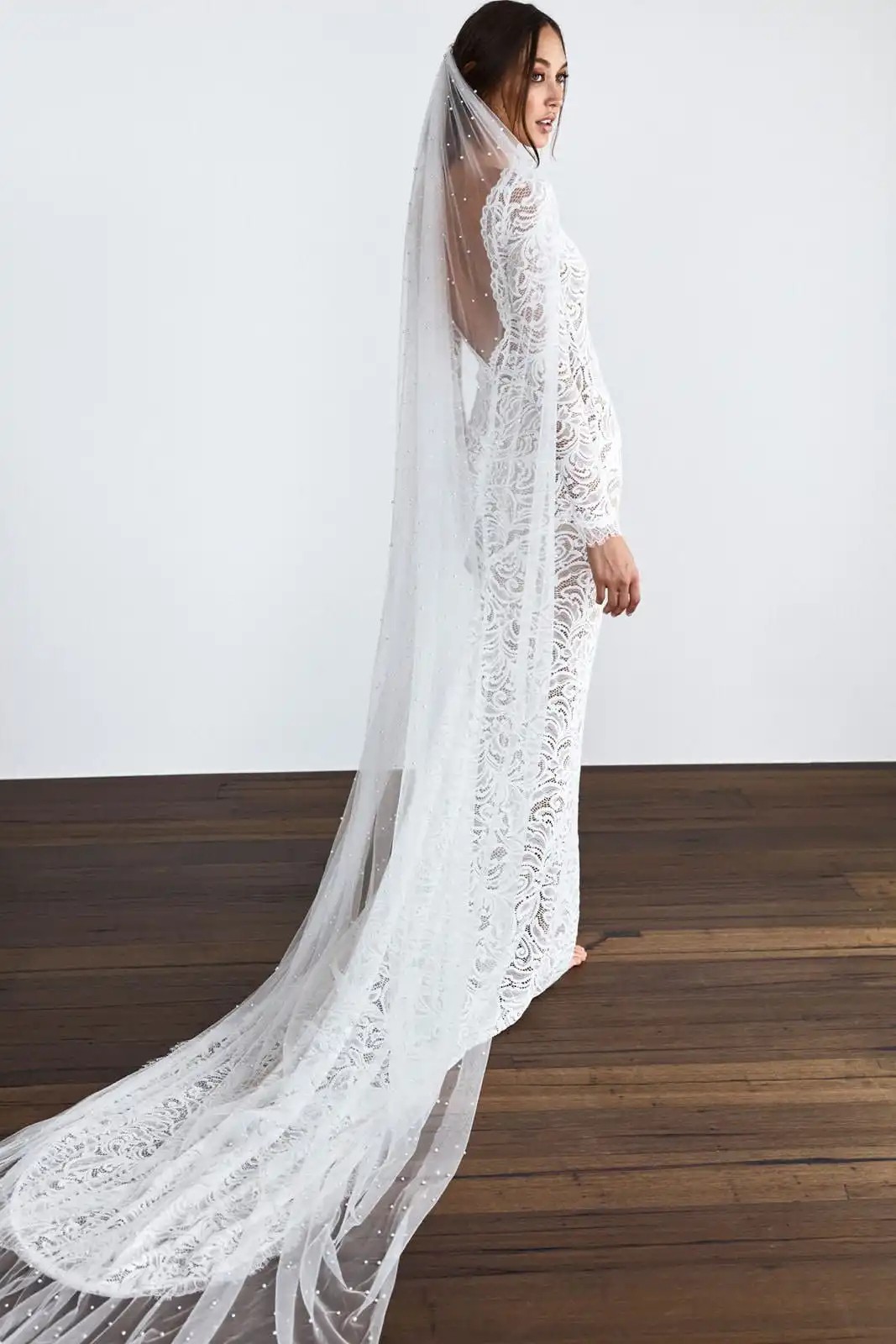 Hvidt bryllups slør 300 cm med fine perler og metal kam. Katedral længde for en markant festlig effekt. Fuld beskrivelse