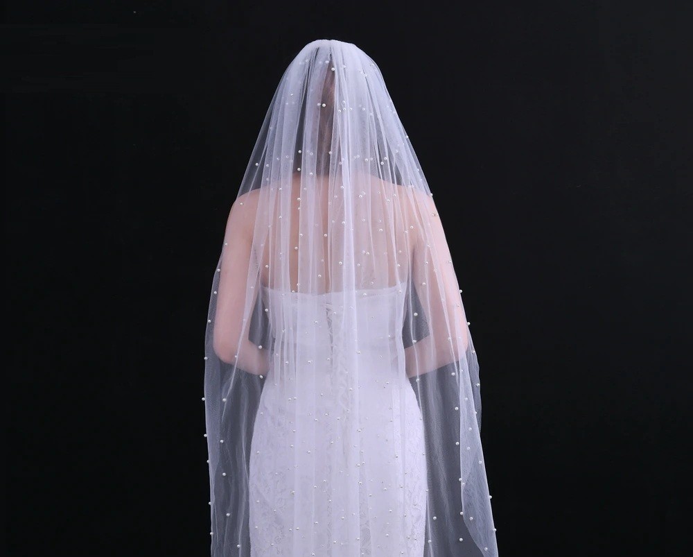 Hvidt bryllups slør 500 cm med fine perler og metal kam. Luksuriøs katedral længde til en storslået indgang. Fuld beskrivelse