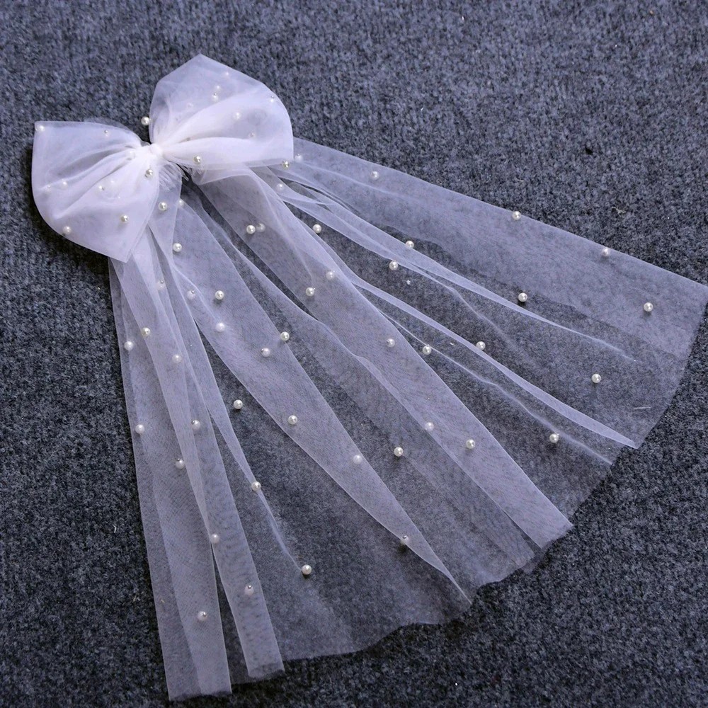 Elegant hvid bånd af tyl med perler og langt bånd til bryllups-, festlige og romantiske frisurer til bruden. Fuld beskrivelse