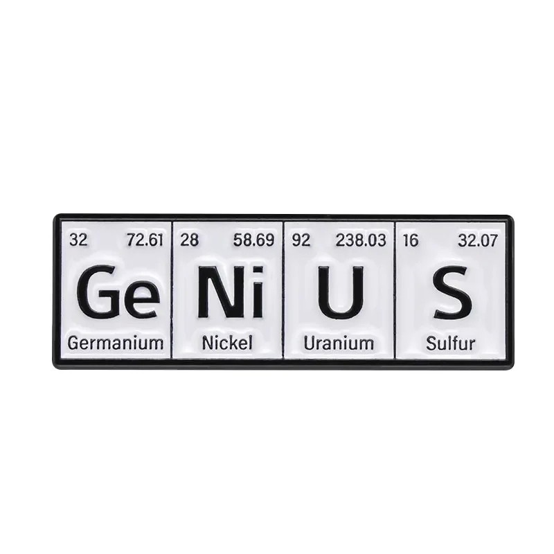 Denne kemiske broche med motiv af grundstofferne i den periodiske tabel fanger med sit enkle, men fantasifulde design. Kombinationen af symbolerne Ge, Ni, U og S skaber en legende tekst, der henviser til kemiens og videnskabens verden. Takket være sit kompakte design passer den som et tilbehør til tøj, rygsæk eller taske. Det sort-hvide design fremstår rent og kombineres godt med forskellige stilarter.