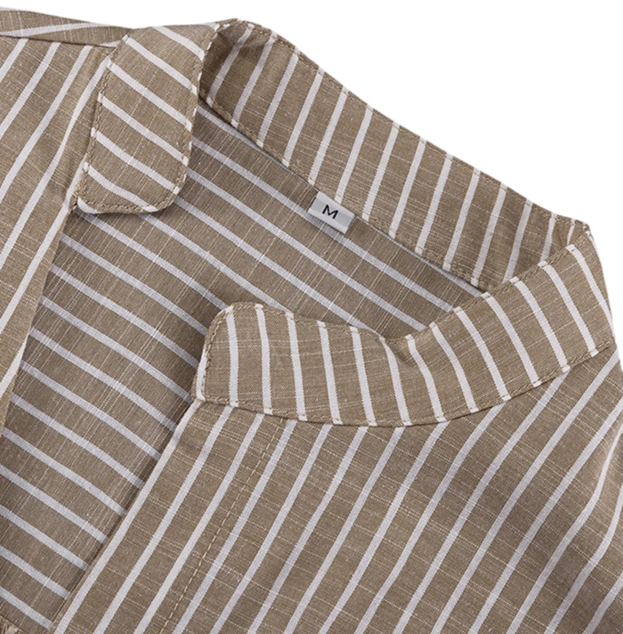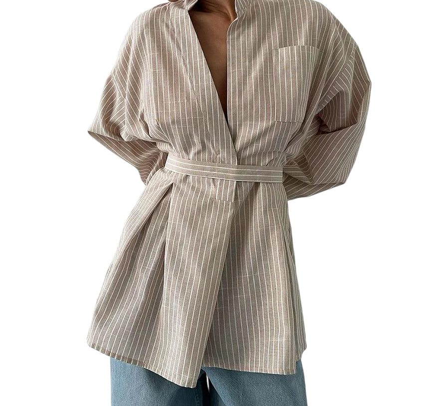 Forside Forside Tøj og tilbehør Dametøj Skjorter til kvinder Stribede skjorter til kvinder Dame brun stribet skjorte med krave og lange ærmer Stilfuld bluse med sløjfe på ryggen i taljen Polyester- og bomuldsblanding