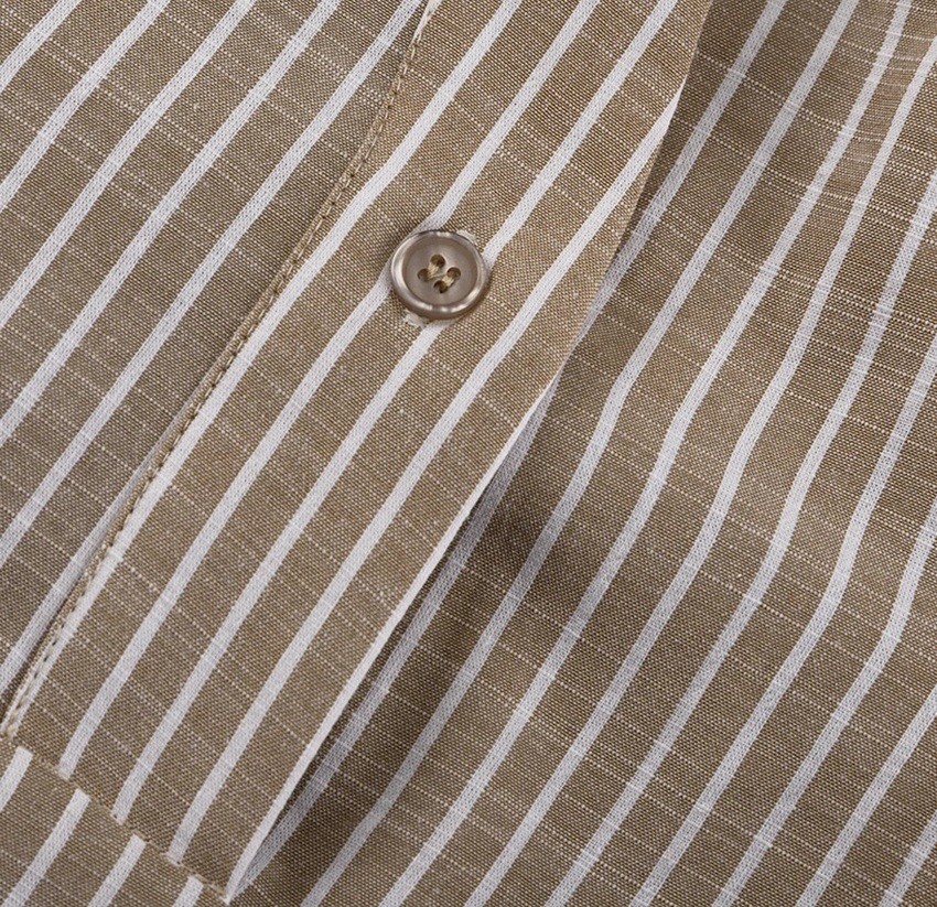 Denne dame stribet brun skjorte med krave og sløjfe på ryggen repræsenterer den perfekte kombination af elegance, komfort og originalitet. Fremstillet af kvalitetsblanding af polyester og bomuld, tilbyder den en behagelig følelse ved berøring, holdbarhed og nem vedligeholdelse. Lang ærme og klassisk krave giver blusen et tidløst udseende, mens sløjfen omkring taljen på ryggen fremhæver den kvindelige silhuet og tilføjer et pift til outfittet. Den brune farve med fine hvide striber virker elegant og diskret, så skjorten passer både til arbejde og fritid.