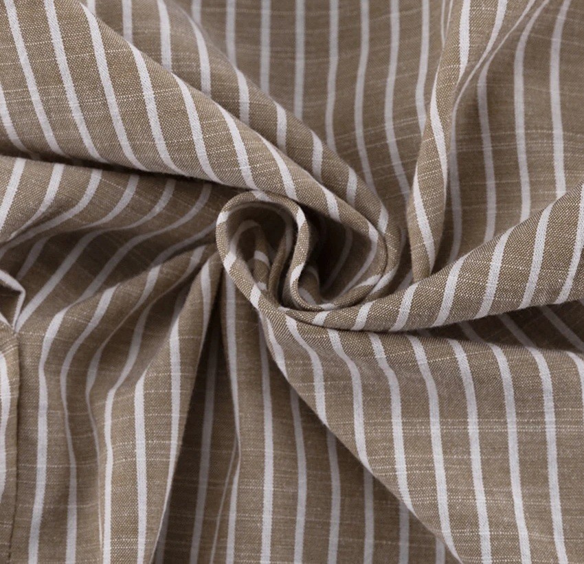 Elegant dame skjorte med sløjfe på ryggen kombinerer brun-hvid stribet design med komfortabelt materiale af polyester og bomuld. Fuld beskrivelse