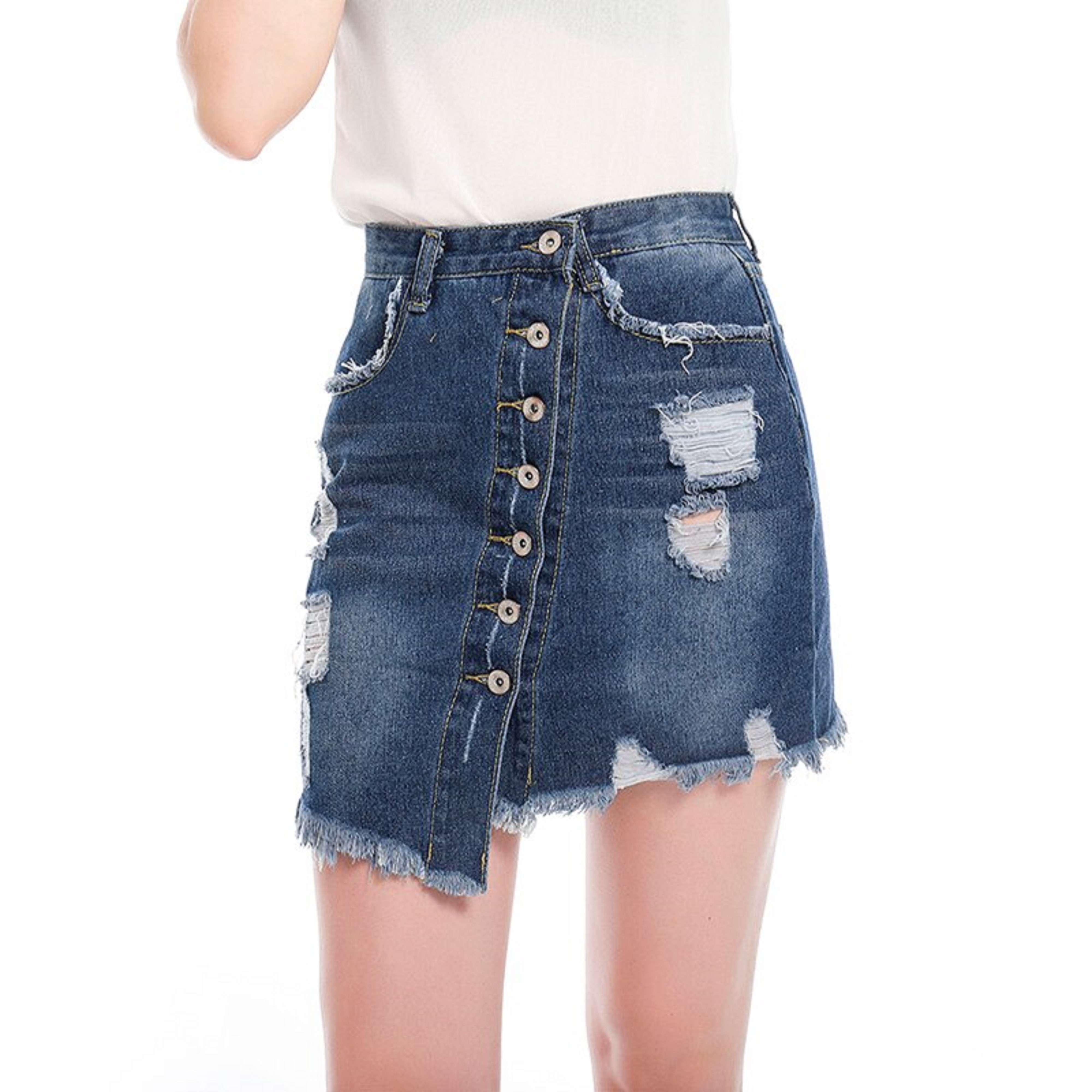 Dame denim mini nederdel, asymmetrisk