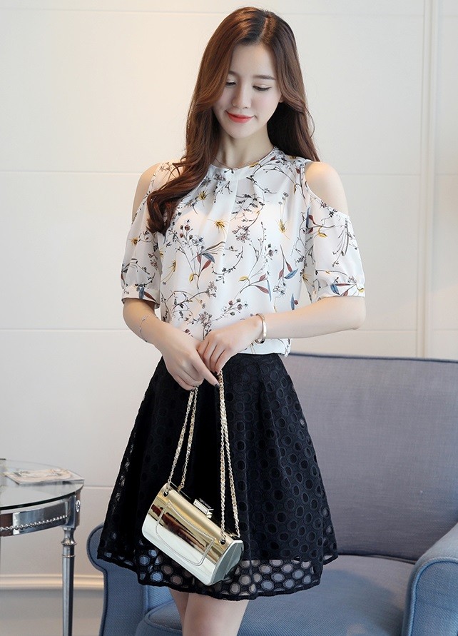 Smuk damebluse med blomstermønster og huller på skuldrene. Du kan tage denne bluse med overalt om sommeren, og takket være det bløde materiale vil du føle dig fantastisk i den.