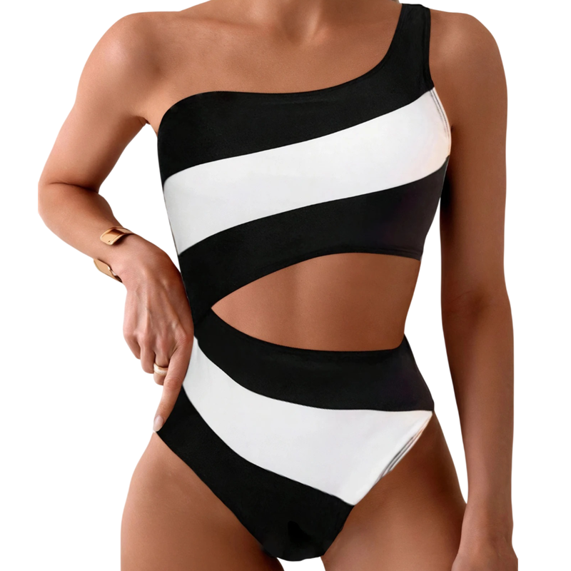 Moderne damebadedragt på én skulder præsenterer et markant modeelement, der fanger opmærksomheden ved første øjekast. Den asymmetriske skæring virker elegant og samtidig meget stilfuld, hvilket gør, at du skiller dig ud på stranden såvel som ved poolen. Det stribede design giver modellen et friskt sommerpræg og fremhæver silhuetten visuelt. Denne én-delte model er det ideelle valg for kvinder, der ønsker at kombinere komfort med et originalt udseende.