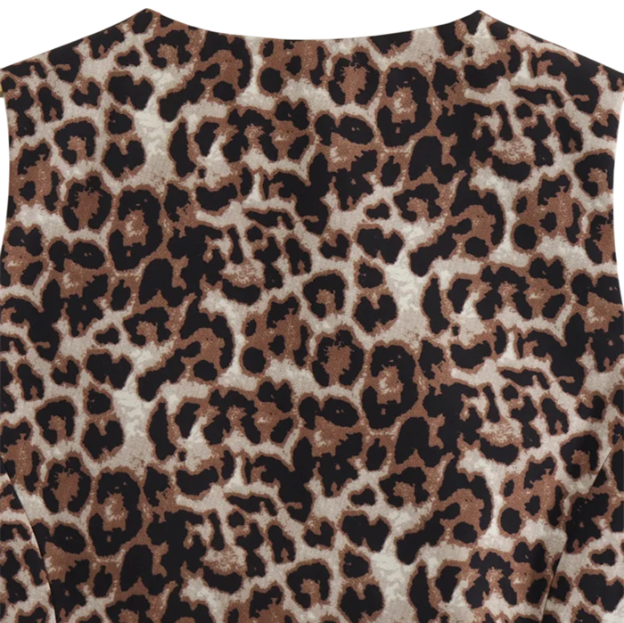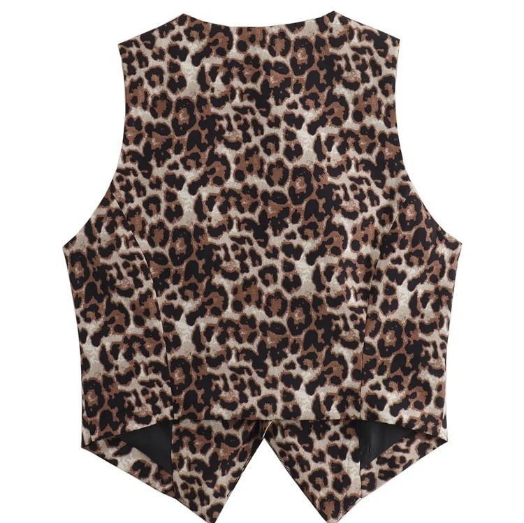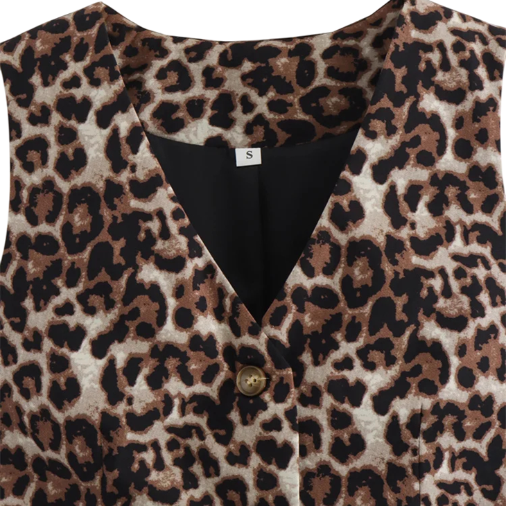 Stilfuld dame vest med leopardmønster og V-udskæring. Knaplukning og let polyester materiale for et elegant og moderne udseende. Fuld beskrivelse