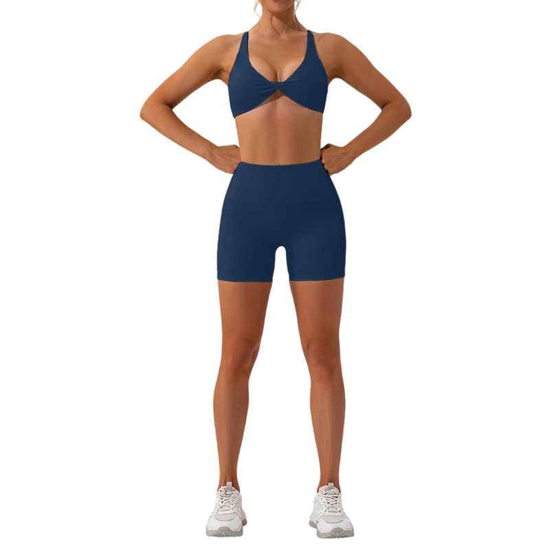 Dame sæt med shorts og sportsbh, ensfarvet, lavet af materialerne spandex og nylon. Ideel til sportsaktiviteter, fitness eller fritid. Fuld beskrivelse