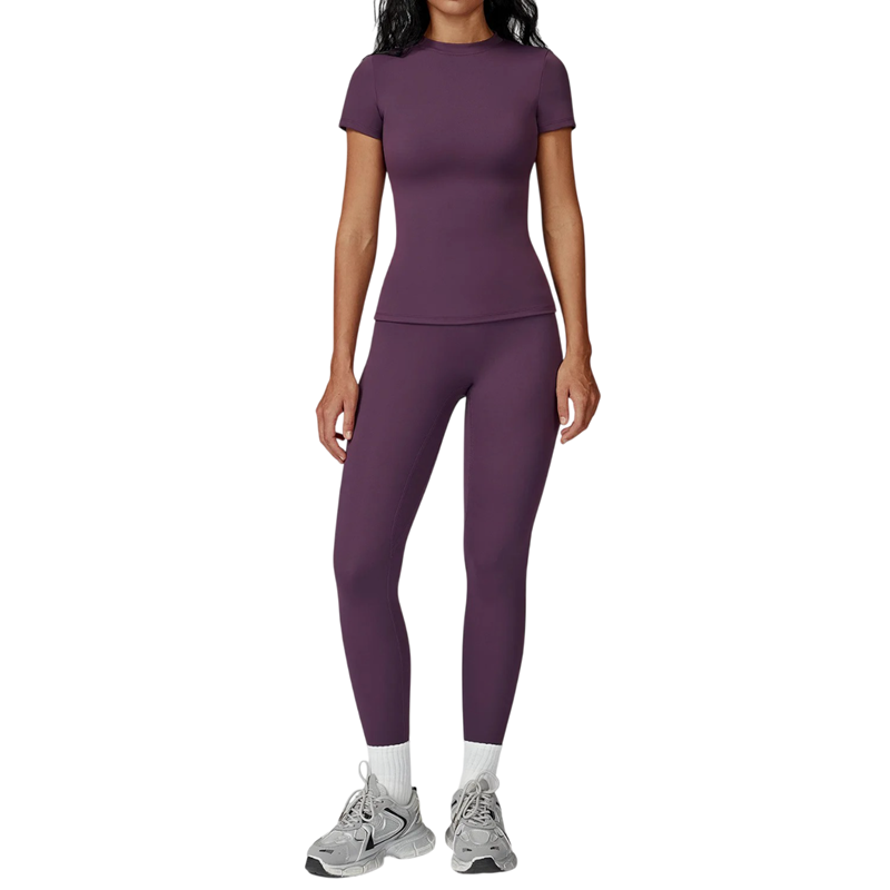 Dame sportssæt med leggings og t-shirt med korte ærmer lavet af nylon og polyester. Ideel til fitness, træning eller fritid, behageligt og elastisk materiale. Fuld beskrivelse
