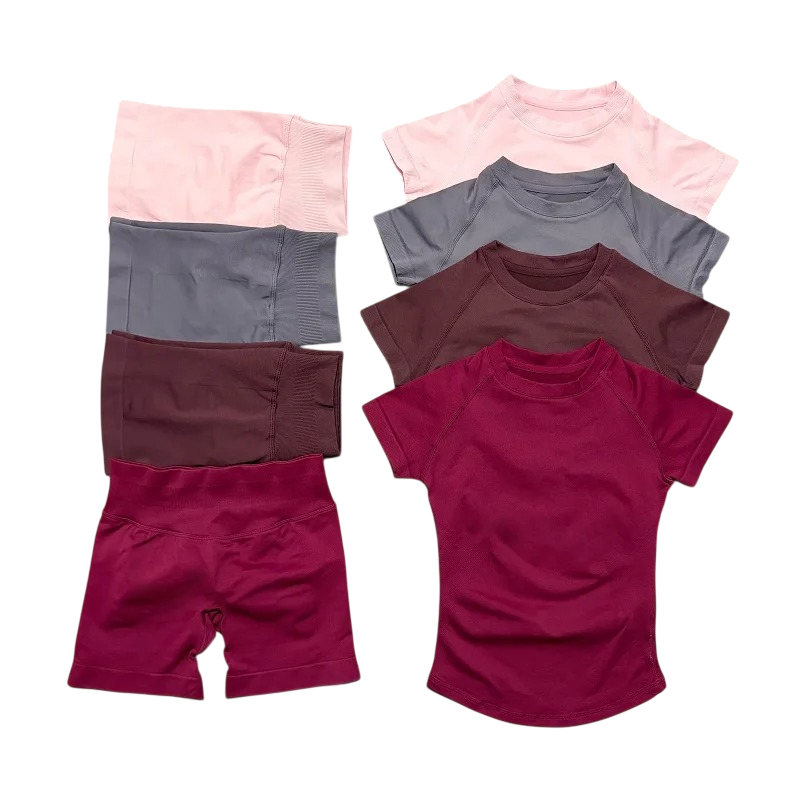 Dame sportssæt med shorts og t-shirt med korte ærmer lavet af nylon og spandex. Ideel til fitness, træning eller fritid, komfortabel og elastisk materiale. Fuld beskrivelse