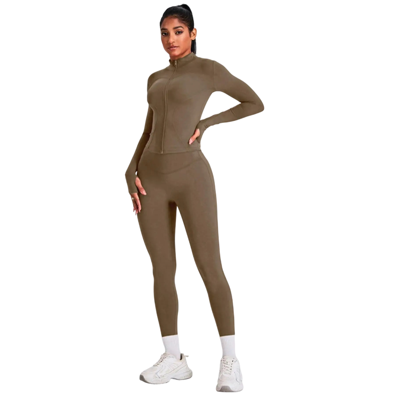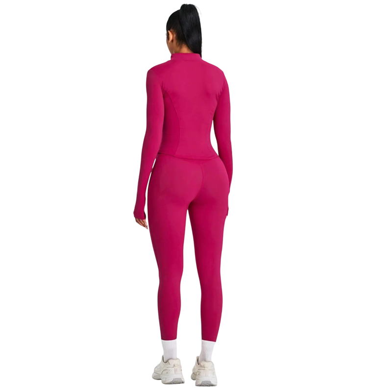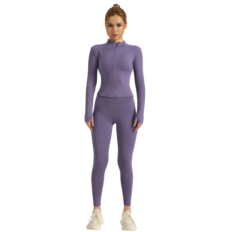 Dette sportssæt er ideelt til fitness, yoga, pilates, løb og almindelig brug. Lynlåsen på t-shirten giver et sporty udseende og øger samtidig praktiskheden af hele outfittet. Det elastiske materiale understøtter den naturlige bevægelsesfrihed og hjælper med at bevare tøjets form, selv efter gentagen vask.