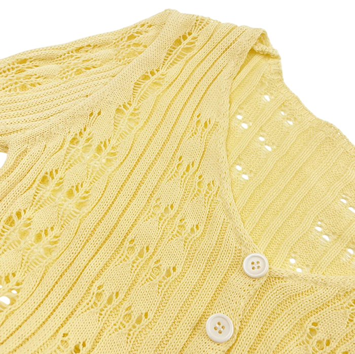 Elegantisk dame cardigan med V-udskæring, knaplukning og udvidede ærmer. Behagelig og stilfuld. Velegnet til hverdagens brug. Fuld beskrivelse