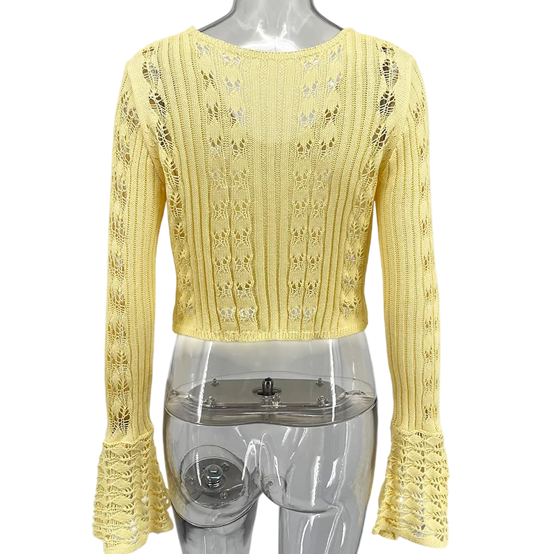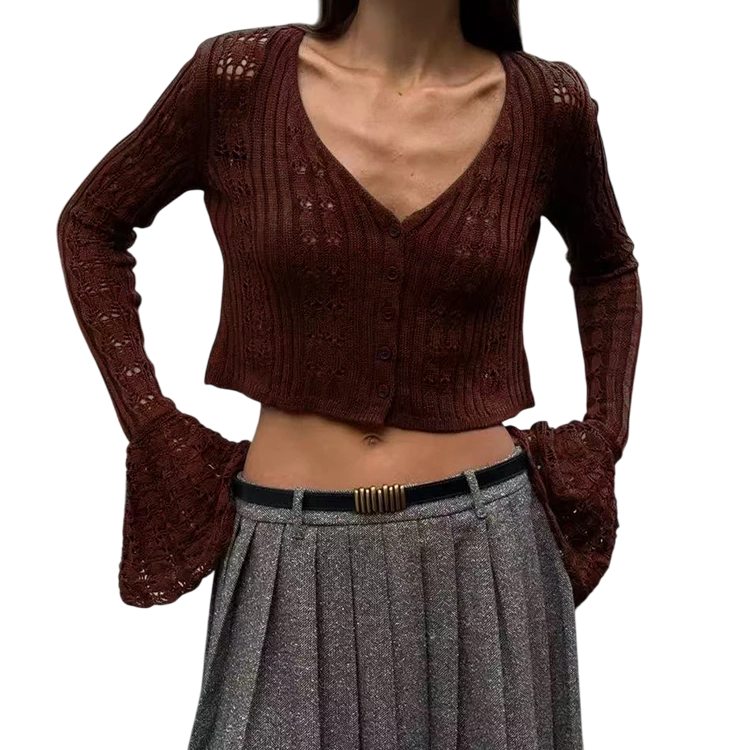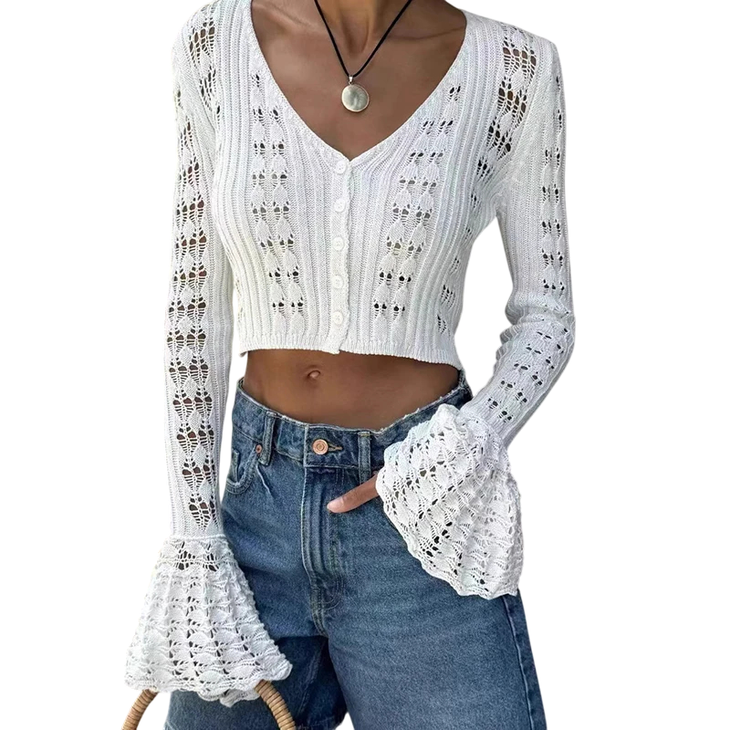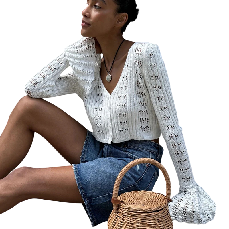 Forside Forside Tøj og tilbehør Dametøj Striktrøjer og cardigans til kvinder Cardigans til kvinder Dame strikket cardigan med V-udskæring Ensfarvet sweater med knaplukning og udvidede ærmer Elegantisk mode sweater Polyester og bomuld