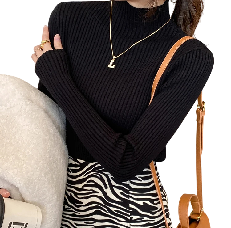 Dame striktrøje med høj hals i bomuld og akryl Ensfarvet elegant trøje med lange ærmer Universel størrelse til efterår og vinter