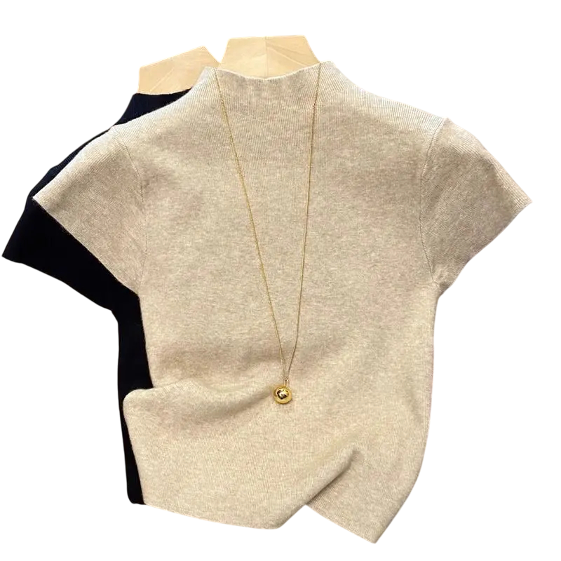 Dame sweater t-shirt i bomuld og polyester med korte ærmer Enfarvet strikket t-shirt med O-hals Elegant og komfortabel stil
