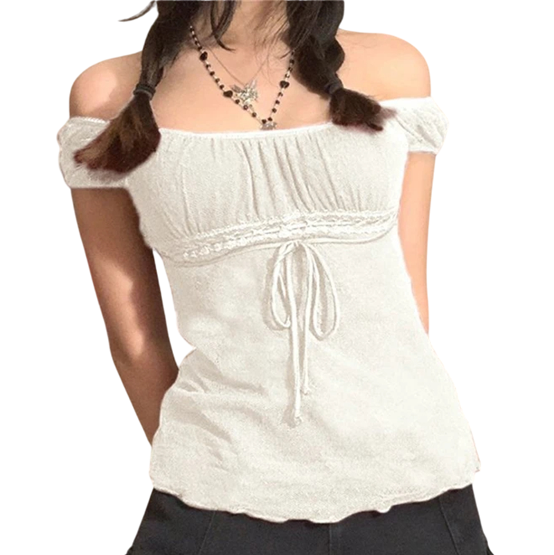 Forside Forside Tøj og tilbehør Dametøj T-shirts og toppe til kvinder T-shirts og toppe med korte ærmer til kvinder Dame top T-shirt med blondedetaljer Blondeærmer Snøring i taljen Elegant bluse med rund hals Til fritid og aftenbrug