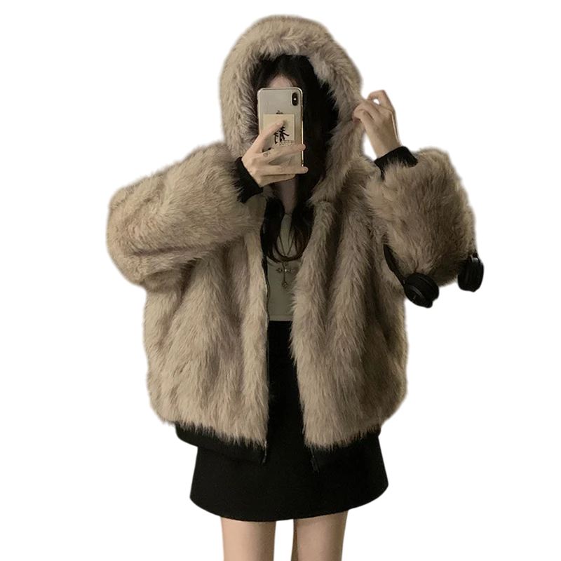Varme tosidet dame vinterjakke med hætte, lynlås, lommer og en varm pels side. Stilfuldt valg til kolde perioder. Fuld beskrivelse