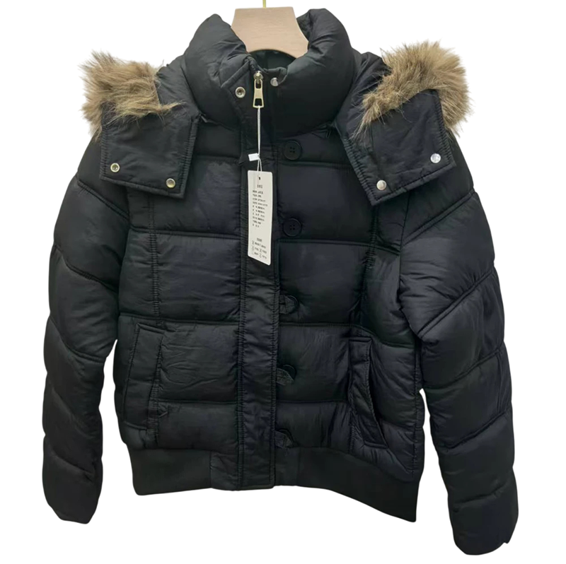 Varm bomulds vinterjakke med hætte og pels, høj krave, dobbelt lukning og lommer giver komfort og beskyttelse i koldt vejr. Fuld beskrivelse