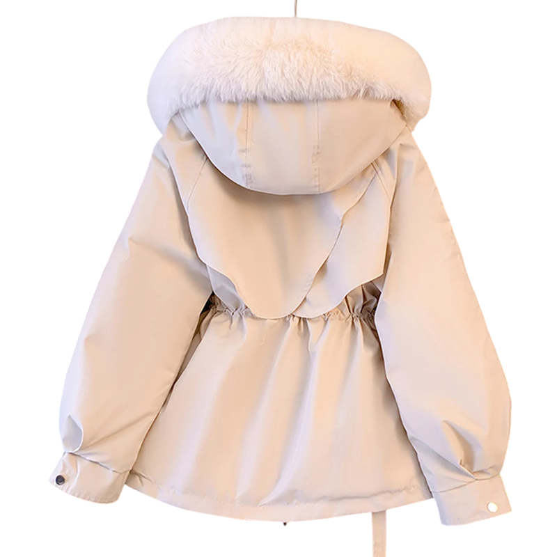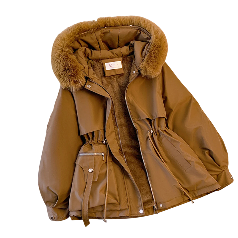 Elegant vinterjakke med hætte og pels, lynlås og knaplukning, praktiske lommer og justerbar snor i taljen. Varm polyesterudførelse til vinteren. Fuld beskrivelse
