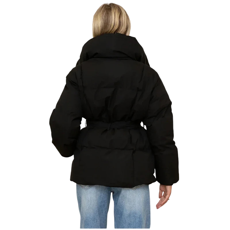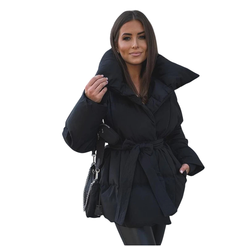 Varm dame vinterjakke med trykknaplukning, krave, lommer og justerbar snor i taljen. Stilfuld og behagelig til vinterdage. Fuld beskrivelse