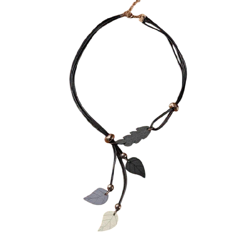 Vedhængene har forskellige nuancer, der skaber kontrast mellem sort, grå og beige. Træbladene er hængt op på en snor og suppleret med små metaldele, der forbinder de enkelte dele. Det samlede design virker harmonisk og kan nemt kombineres med forskellige tøjstile.