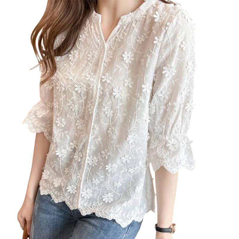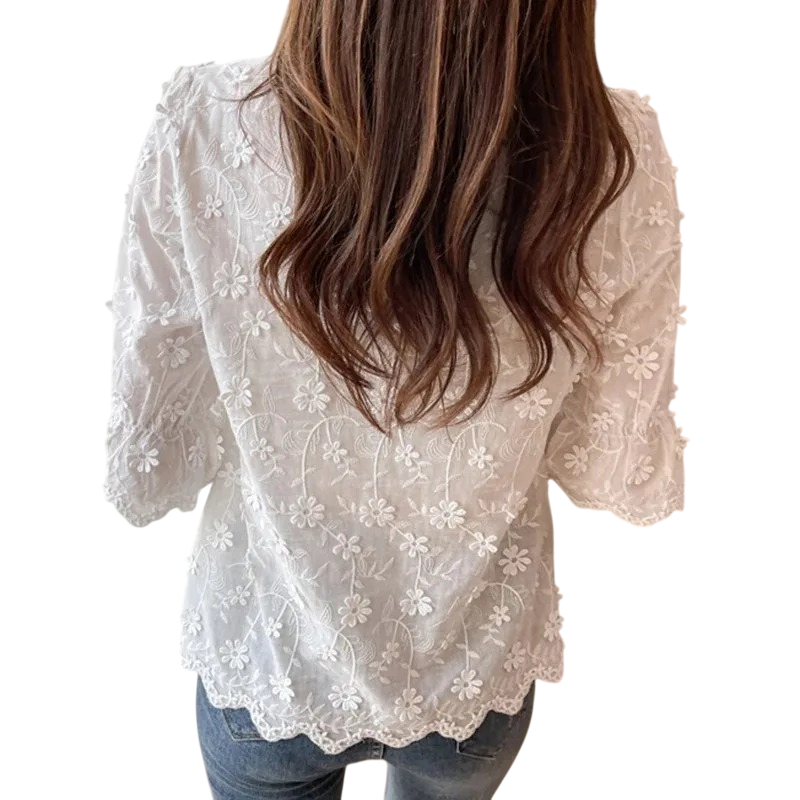 Forside Forside Tøj og tilbehør Dametøj Bluser til kvinder Bluser med korte ærmer til kvinder Damehvid bluse V-udskæring Trekvartærmer Blomsterkant Elegant bluse i polyester og bomuld